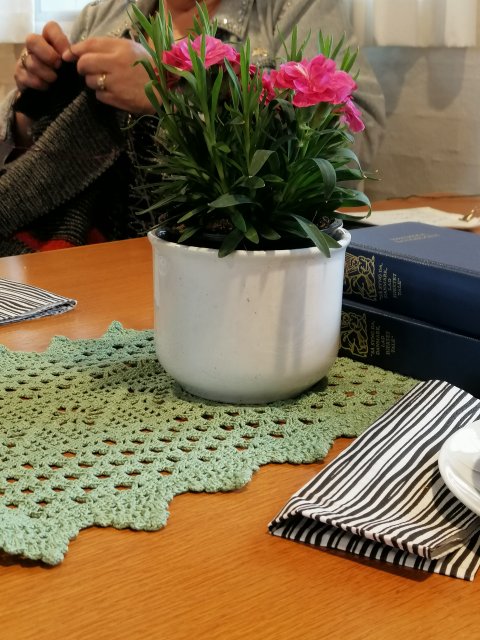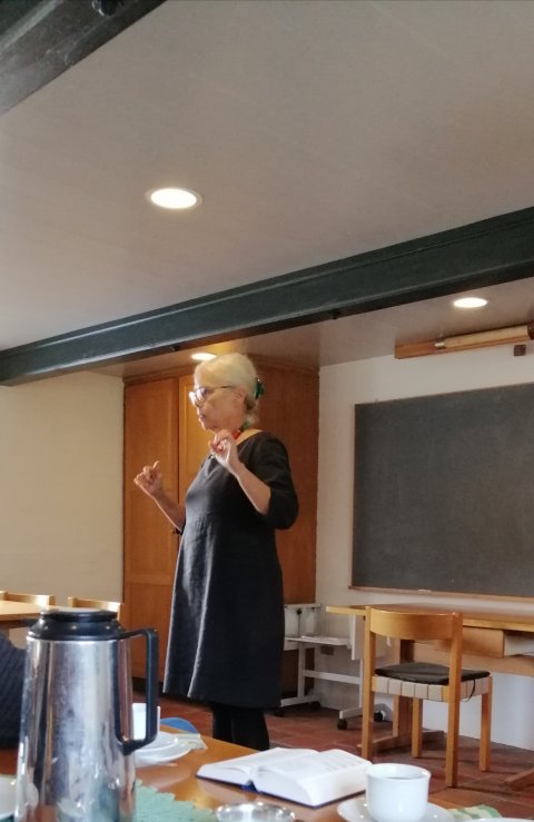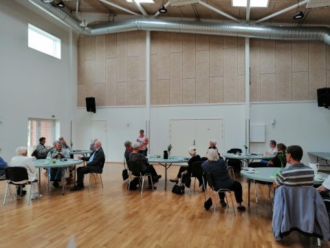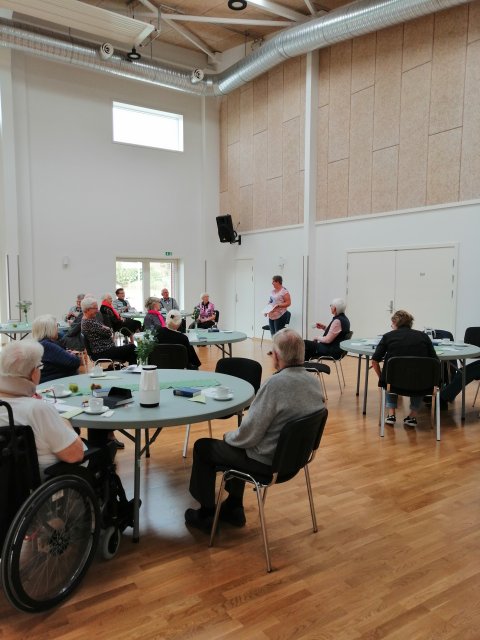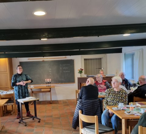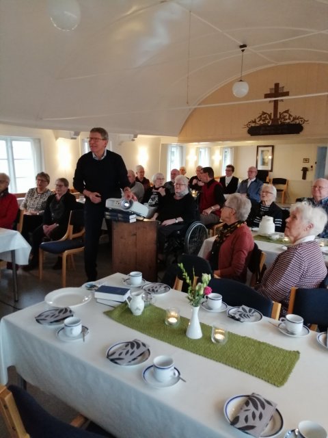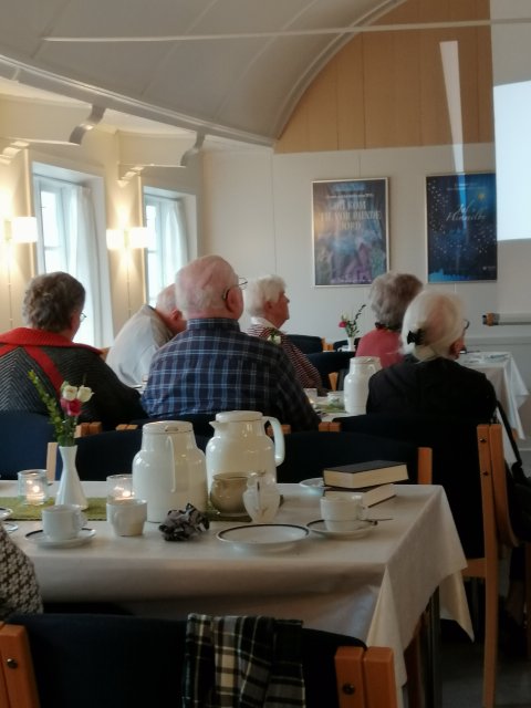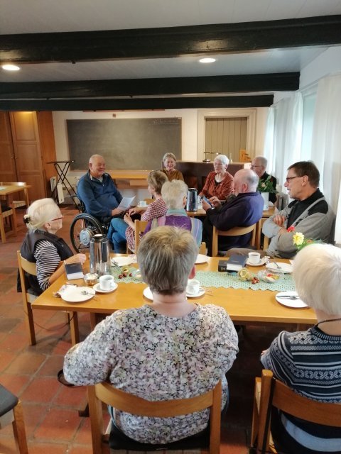 Skal - skal ikke.... der var fortsat corona udfordringer at takle inden opstart her i efteråret. Både kirkehuset og konfirmandstuen var for små til det vanligt pæne fremmøde, så salen på Farup Fælled blev booket, så kunne afstandskravene opfyldes. Runde borde blev fordelt i salen, kopper og kage sat frem, foredragsholderen var klar, så var det bare at vente på deltagere, der var trygge ved at møde op.